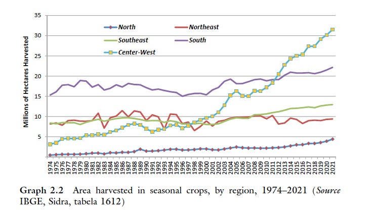 It is true that agricultural land use trends have been flat across much of Brazil. This is true for all regions except one, the Center-West, where the area under cultivation has trippled. This is the region critical for the agricultural boom, particularly in soy.