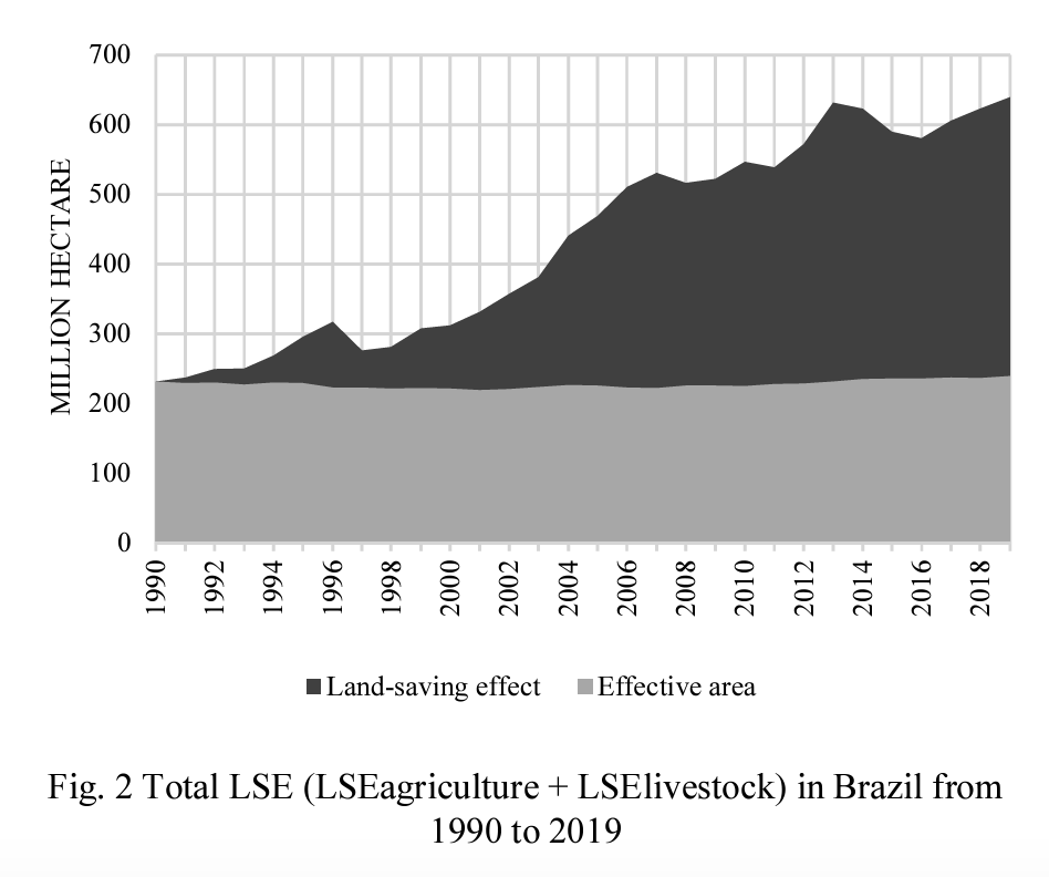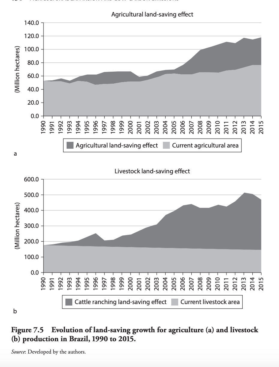 There has indeed been some productivity increase in Brazilian farming, but the land sparing story applies with real force to animal husbandry, not to farming where land use has increased. Furthermore, lumping together the land use of all farming hides further important differences.
