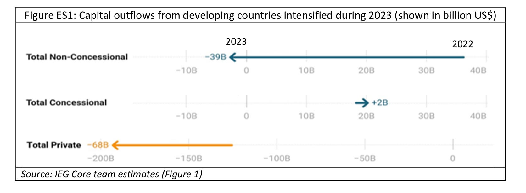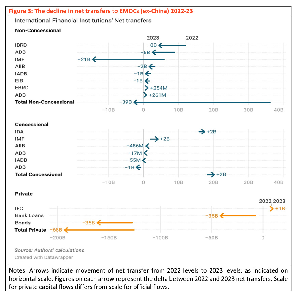 This combination of flows should rob of us of any illusions about the actual operation of public-private development finance when it comes under short-term stress. The idea of so-called “blended development finance” is that modest amounts of public funds will be intelligently leveraged to generated larger private flows. What happened in 2023 was the reverse. With private funding accelerating its retreat from 2022 to 2023, non-concessional development funding was procylical. Far from increasing it not only decreased, but became net negative. And though concessional funding, to the poorest most-stressed borrowers, increased, it did so to a minuscule degree and was entirely powerless to off-set the overall rebalancing.
