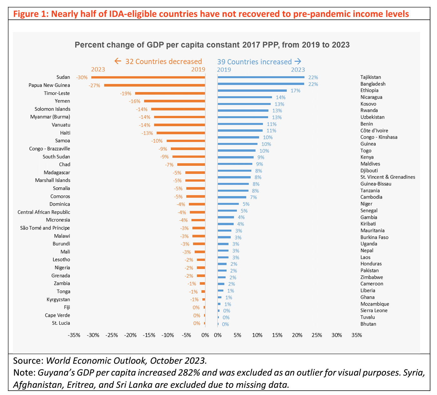About half of International Development Association (IDA)-eligible countries failed to recover to pre-pandemic income levels. Per capita growth was anemic: 0.7% in Africa, 0% in the Middle East, and 1.5% in Latin America, partly because of weak investment levels. Currently, gross investment in most emerging market and developing countries (EMDCs) barely covers the depreciation of the existing capital stock; investment rates are in the range of 20-25% of GDP in all regions except Asia, where the average investment rate is 38% of GDP. The consequence of such low investment rates is that EMDCs will be unable to transition to green economies, to adapt to already-present climate change, or to sustain rapid growth, with dire impact on their own populations and on the global efforts to reach net zero.