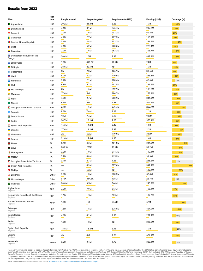 The shocking thing is that to meet the most urgent humanitarian needs of the region the relief agencies are asking, all told, for less than $20 billion. For all humanitarian emergencies around the world, the ask in 2023 was $56.7 billion. That is barely more than half the emergency package that just passed Congress, centered on America’s geopolitical spheres of interest in Ukraine, Palestine and Indo-Pacific. It is no more than the defense budget of one of the larger European countries. It is 0.05 percent of global GDP. And yet to meet the most acute needs of 363 million people, the rich countries of the world could muster only $19 billion dollars.