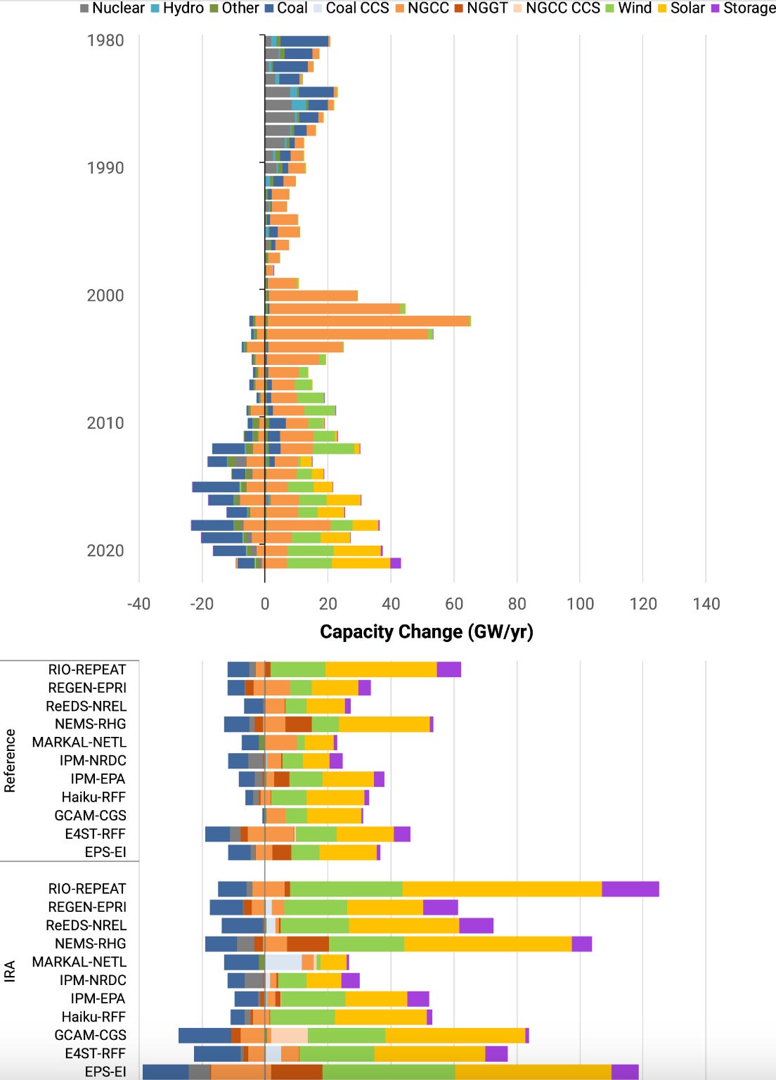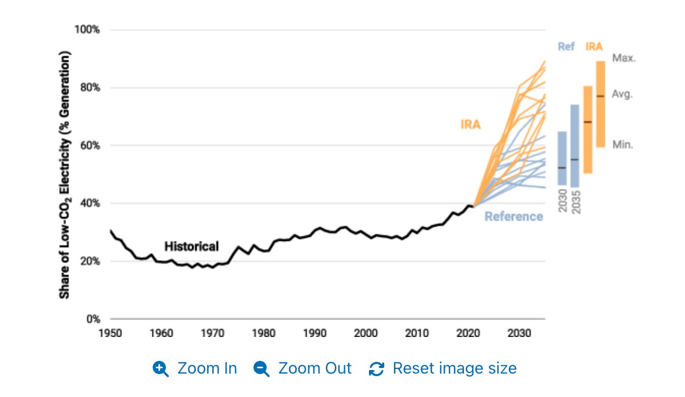 Of course what I am looking for is not just a general comparison of trends but an answer to the nagging counterfactual question: How different would we expect this data to look without the IRA? To get an answer to that question we need models. It is only with their help that we can distinguish the changes attributable to policy interventions as compared to general prevailing conditions and pre-existing trends. The most useful overview of these modeling efforts that I have been able to find is by Bistline et al “Power sector impacts of the Inflation Reduction Act of 2022” in Environmental Research Letters November 2023. If anyone has a better source, please let me know.