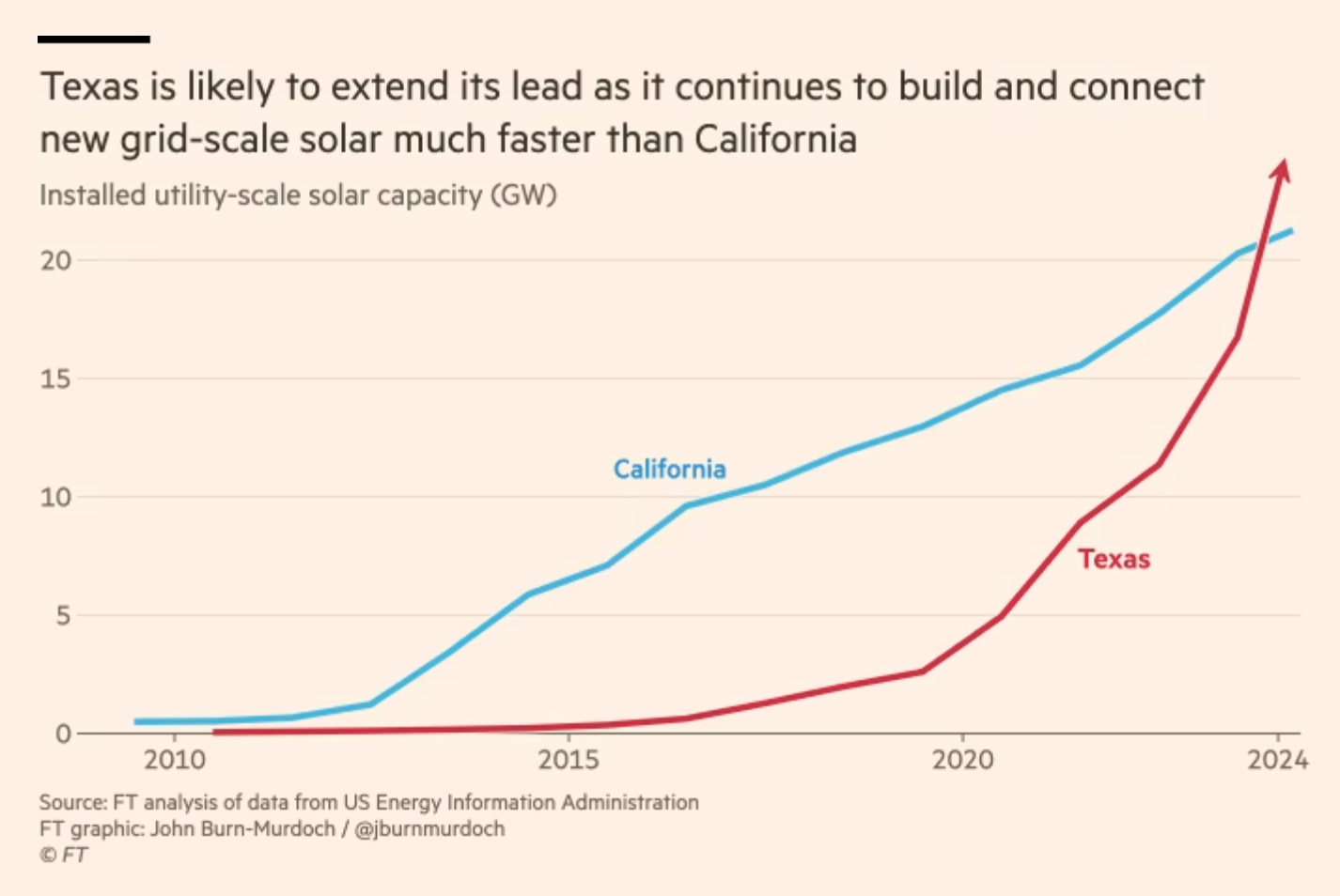 Dramatic things are happening in power generation around the world. As I laid out in Carbon Note 13, in terms of sheer scale, China leads the world in the push for green electricity. But it is not only in China that the world is changing. Even in presumably hostile geographies, renewable power generation is gaining ground, fast. You might think that nowhere was less likely to see a green energy boom than Texas. But, in the last few years, as John Burn-Murdoch pointed out in a recent piece in the FT, utility-scale clean energy generation in Texas has overtaken that in California, America’s champion of all things green. Of course, energy is not “one thing”. Oil can be burned to generate electricity, but you don’t generally run your air conditioner on oil. The wind blows in Texas and the sun shines and Texans know a bargain when they see one. Since 2019 the build out of utility-scale solar in Texas has overtaken the installed capacity in California.