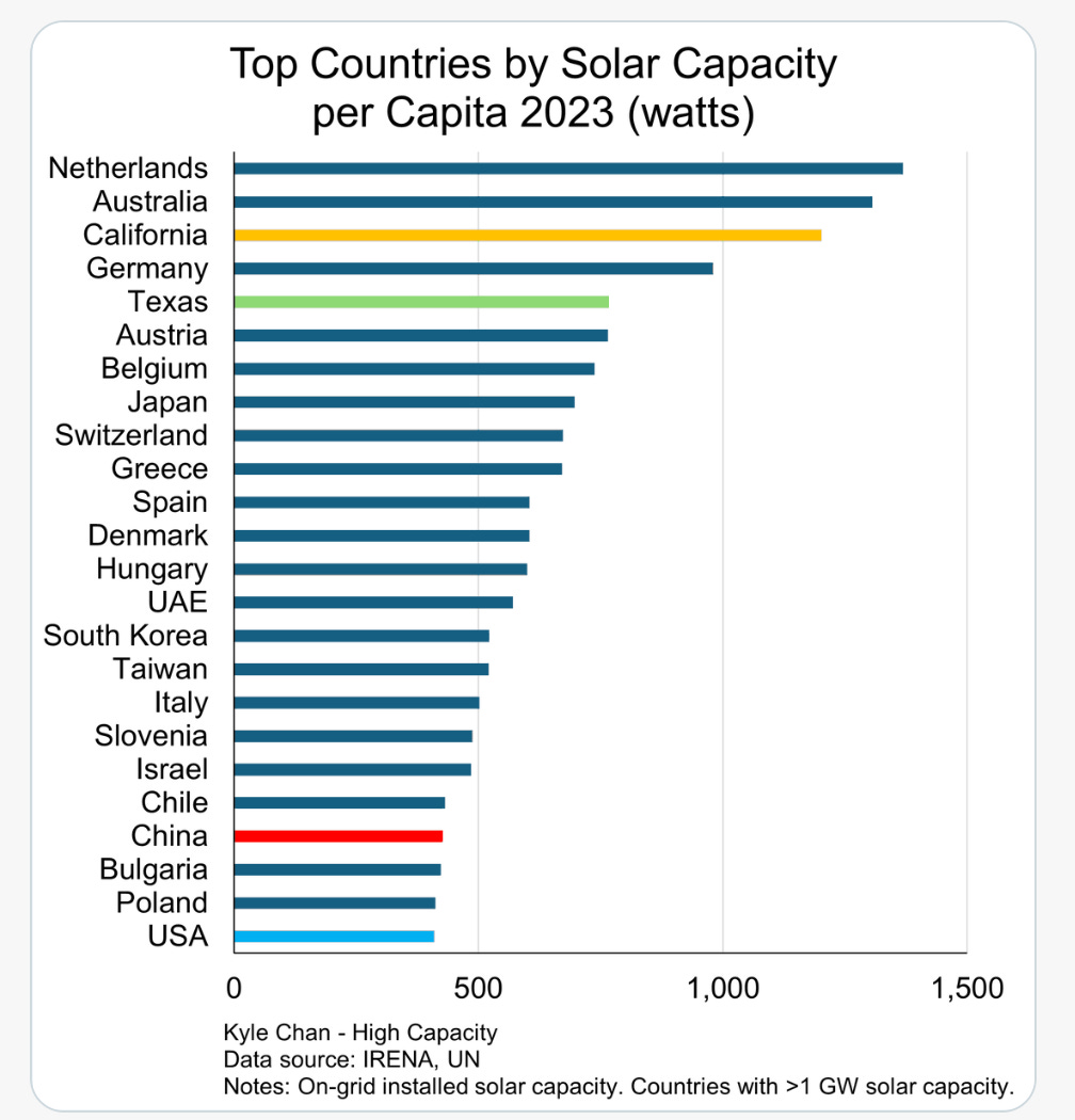 If California (with an economy roughly comparable to that of Germany at current exchange rates) and Texas (with an economy roughly the size of Italy’s) were countries, they would be #3 and #5 in the world in solar capacity per capita.