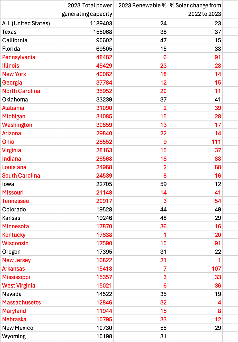 So, with dramatic developments happening across many parts of the United States and the IRA powerfully adding to that momentum, the obvious question is, which are the laggards in the US energy system. To get a general overview I used data from Climate Central to rank US states by their importance in terms of overall electricity production (capacity), their current position in the energy transition (proxied by the share of wind and solar in total state-level generating capacity) and their momentum as measured by the growth of solar in 2022-2023. The states that I have highlighted in red stand out either for their unusually low existing level of renewable power capacity or their lack of current momentum. To give one important example, Florida avoids the red mark because of the considerable push in solar.