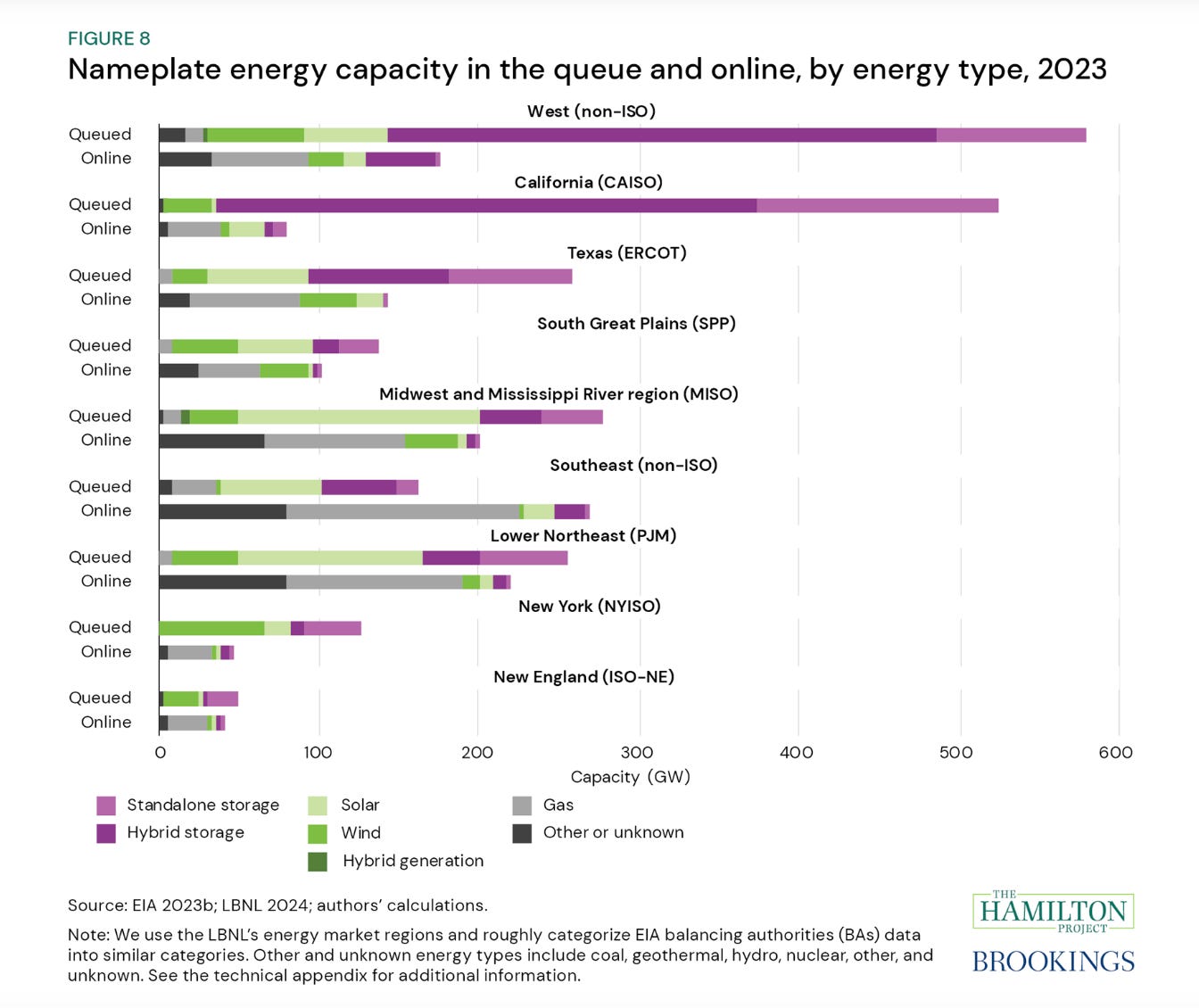 The numbers would be even larger if it were not for the truly surreal logjam in California’s system for authorizing interconnections. According to Hamilton/Brookings data the volume of hybrid solar and batter capacity in the queue for approval is 6.5 times the capacity currently operating in the state. In other words there is an entire energy transition waiting to happen when the overloaded managerial processes of the system catch up. Texas’s less bureaucratic system seems to be one of its key advantages in the extremely rapid roll-out of solar.