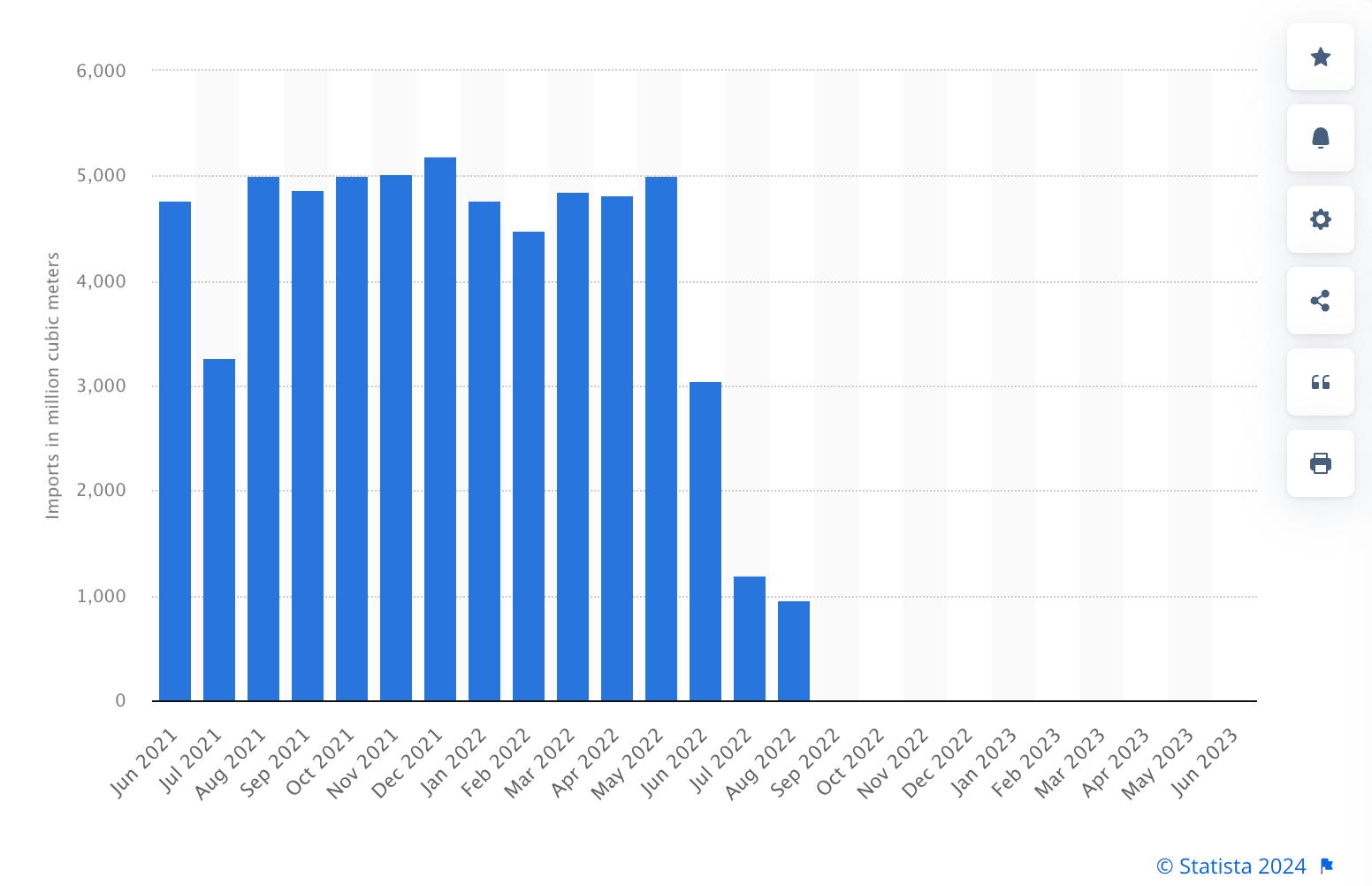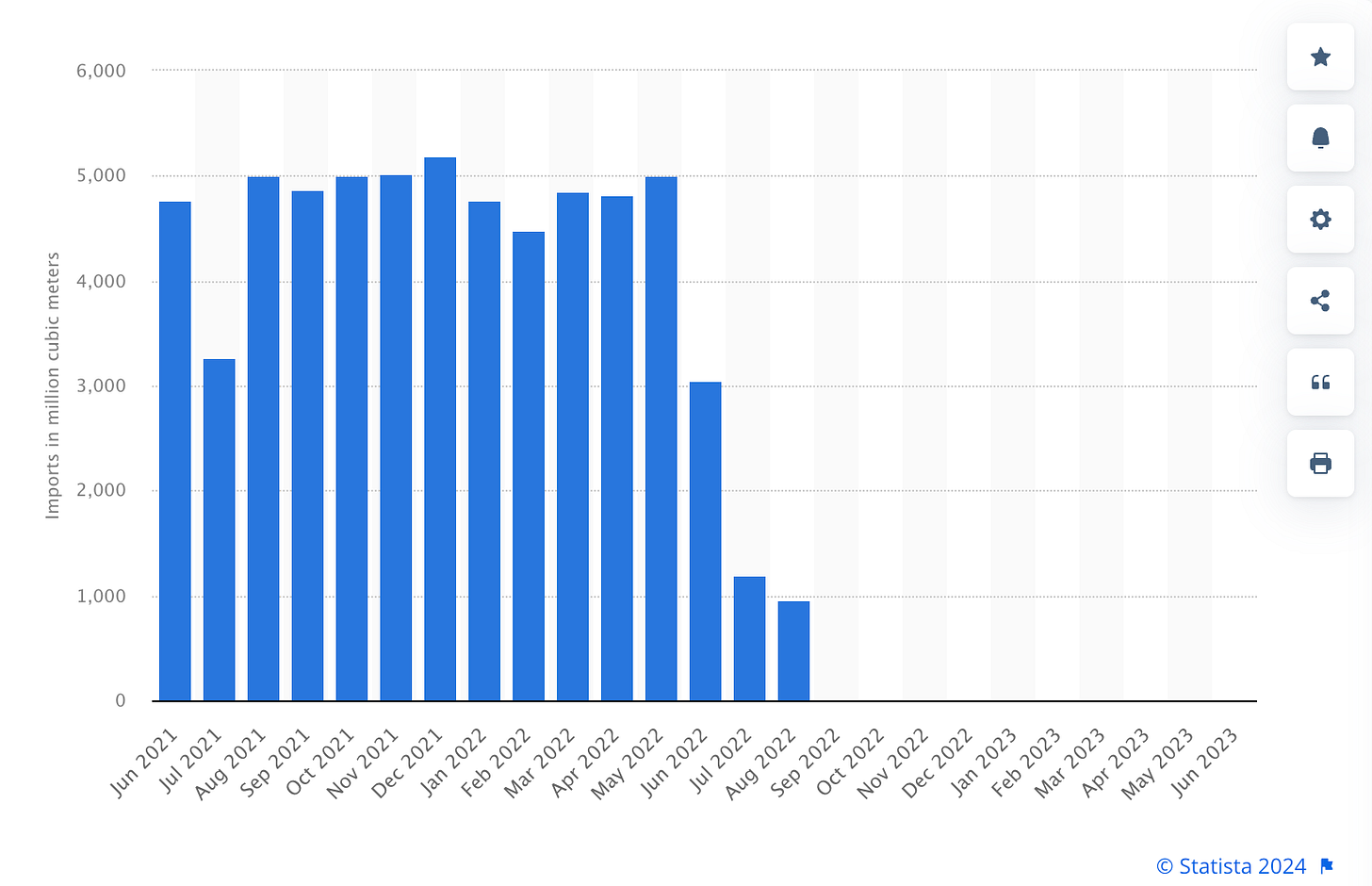Import volume of natural gas from Russia in Germany from June 2021 to June 2023(in million cubic meters)