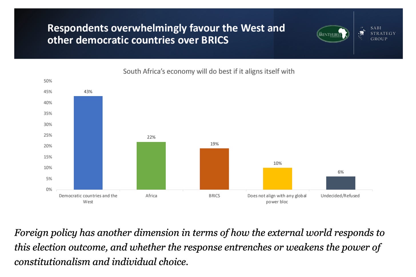 The ANC’s pivot to a more militant foreign policy, aligned with the BRICS, did not convince the voters. By a margin of 2:1 South Africans considered a Western alignment more favorable for the economy than alignment with the BRICS or with the rest of Africa.