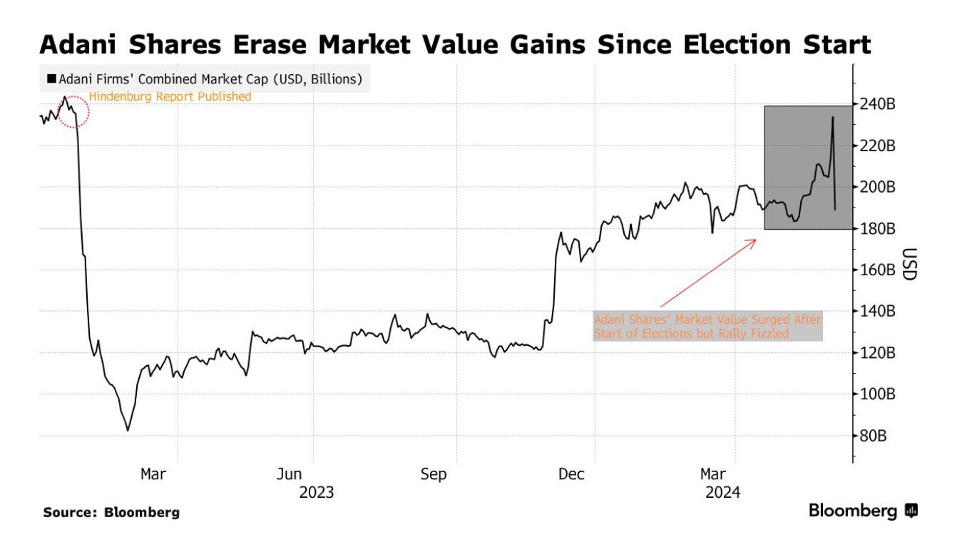 For Adani the one-day impact of an underwhelming election win for Narendra Modi’s party was worse than a serious short-seller attack. The Indian tycoon’s wealth collapsed by $25 billion on Tuesday. Every part of his Adani Group sold off, wiping out almost $45 billion in market value in a one-day shock.