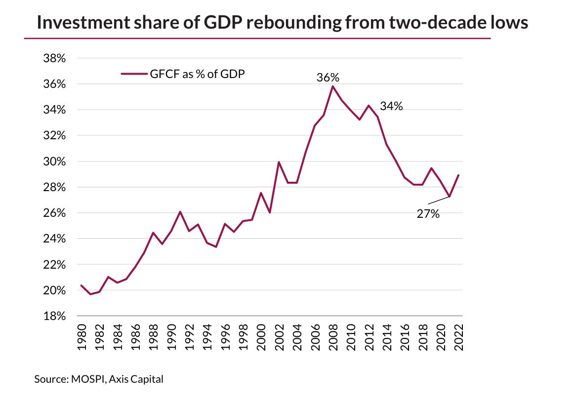Contrary to the hype, investment in India as a whole has not surged. As a share of GDP it is down from his high of 36 percent in the 2000s.