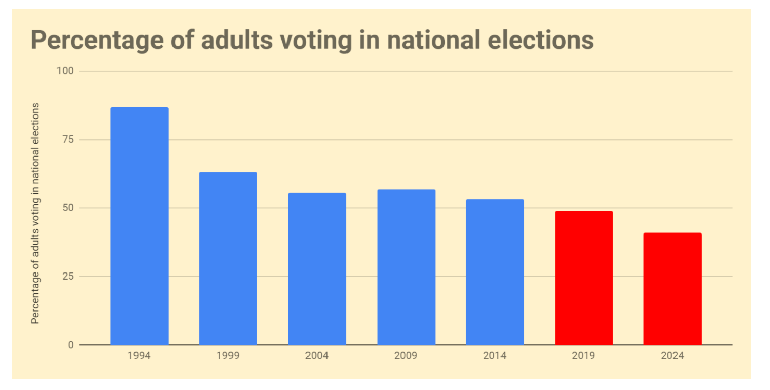 The most damning statistic about the election is not so much the ANC slumping to 40 percent, as the lack of political engagement amongst South Africa’s population. Once we allow for low rates of voter registration (64%) and turnout of less than 59 %, barely more than 40 percent of the adult population participated in the election. Amongst younger South Africans, the principal victims of 50 percent youth unemployment rate, participation was even lower.