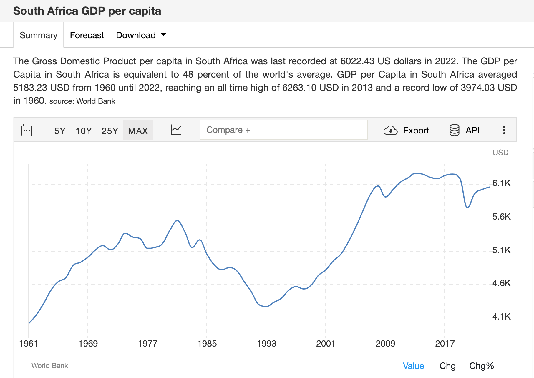 Since 2008 S. Africa has experienced stagnation in gdp per capita (measured here in 2022 dollars).
