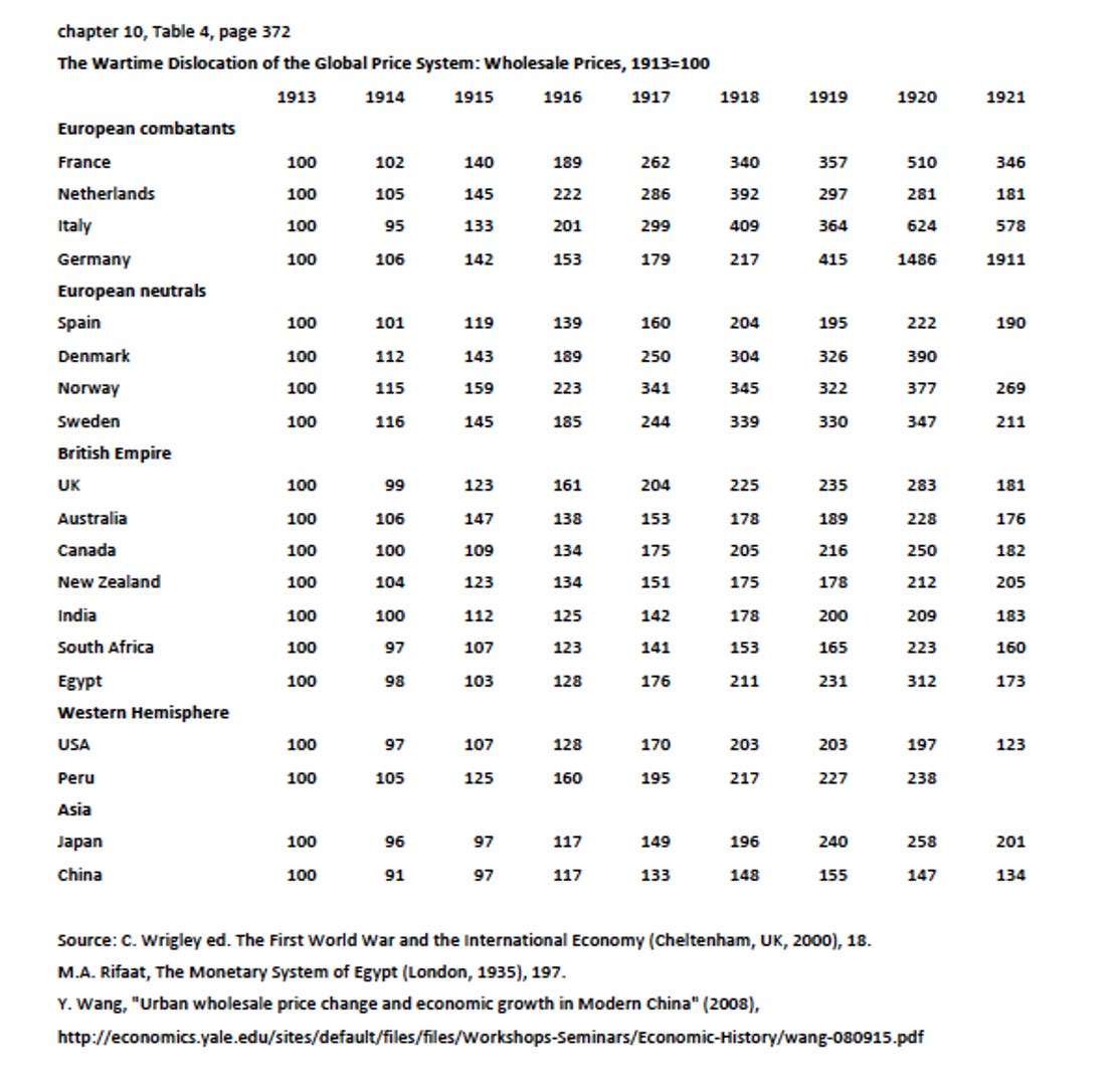 When we think of inflation and World War I we think of Germany. But, in fact, the Great War resulted in a comprehensive dislocation of the price system around the world. Under the pressure of wartime spending and huge deficits, prices surged everywhere. After 1914, literally nowhere on the planet was exempt from inflation.
