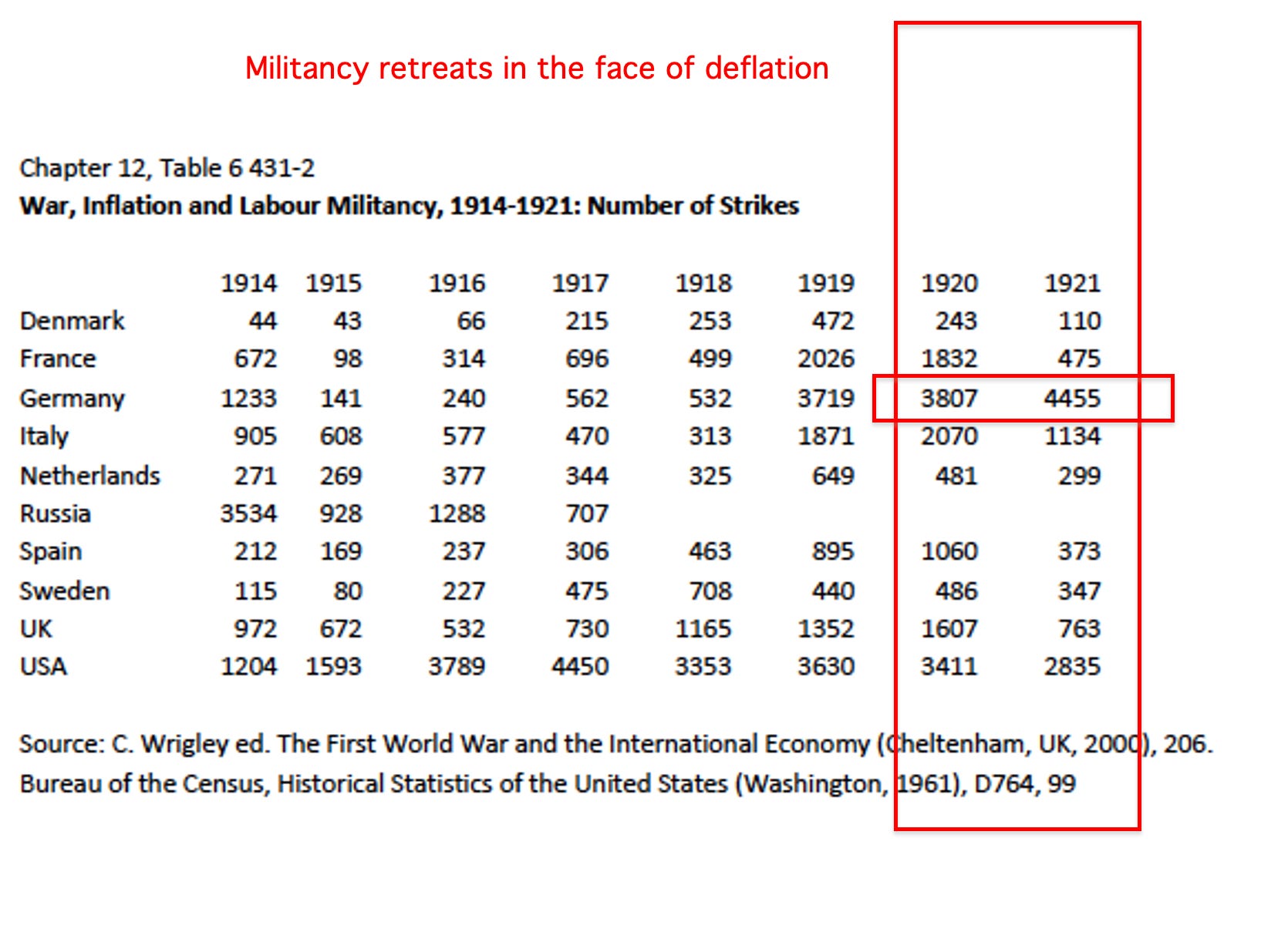 The effect, as in the United States was to reverse the balance of power between organized labour, capital and the government and its creditors. Across the world, the postwar strike wave was broken in what Charles Maier evocatively referred to as the “global thermidor”.
