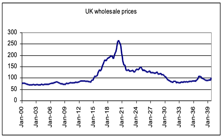 As the table above shows, prices plunged between 1920 and 1921. The UK, the hub of the Imperial economy, and the second most important economy after the United States, plunged into a shock deflation in 1920-1921. Interests rates were hiked. Wartime spending was slashed. Promises of “homes fit for heroes” were abandoned. Prices collapsed chasing America’s deflation in a downward spiral.