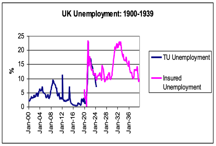 As in the US, the effect on the real economy in Britain was dramatic. In the UK the misery of the interwar period began not in 1929 with the Wall Street crash, but in 1920 with the great postwar shock. Unemployed surged in 1920 and never recovered.