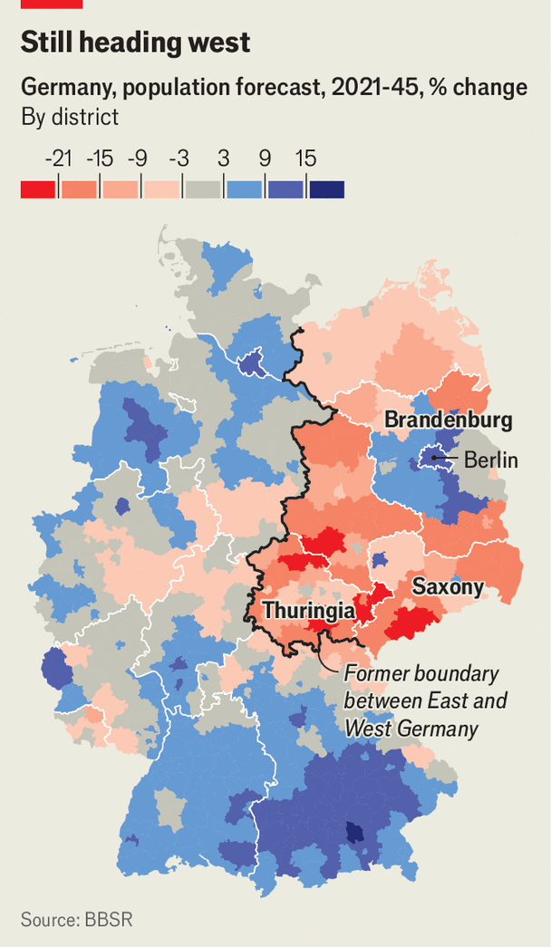 The AfD’s supporters may fear in many cases that they face a precarious future. The East German states continue to hemorrhage population to the West.