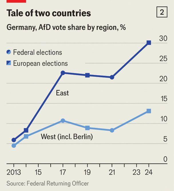 The lurch to the right in the regional elections of the East German states, Thuringia and Saxony, was long foretold. It confirms a growing divergence between Eastern and Western states, which already showed up with a vengeance in the European elections earlier this summer.