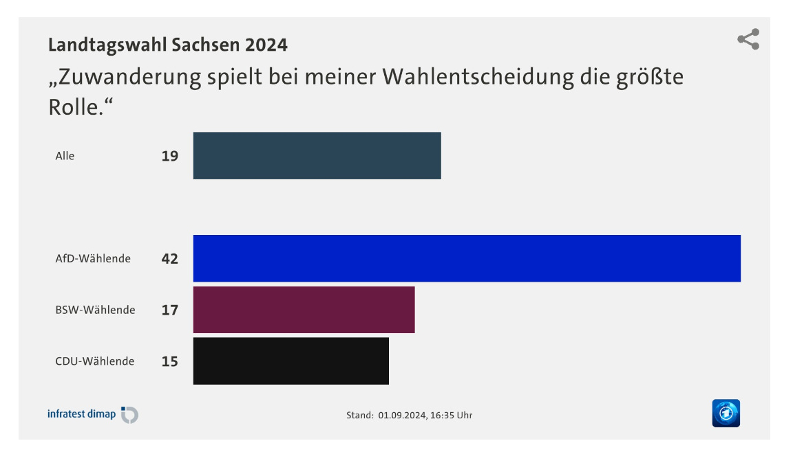 For 42 percent of AfD voters in Saxony, migration was the critical issue. That is twice the share for the average voter in that state.