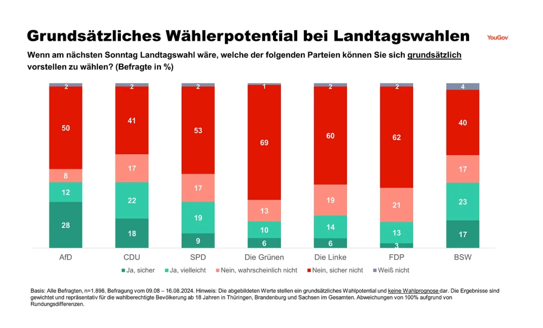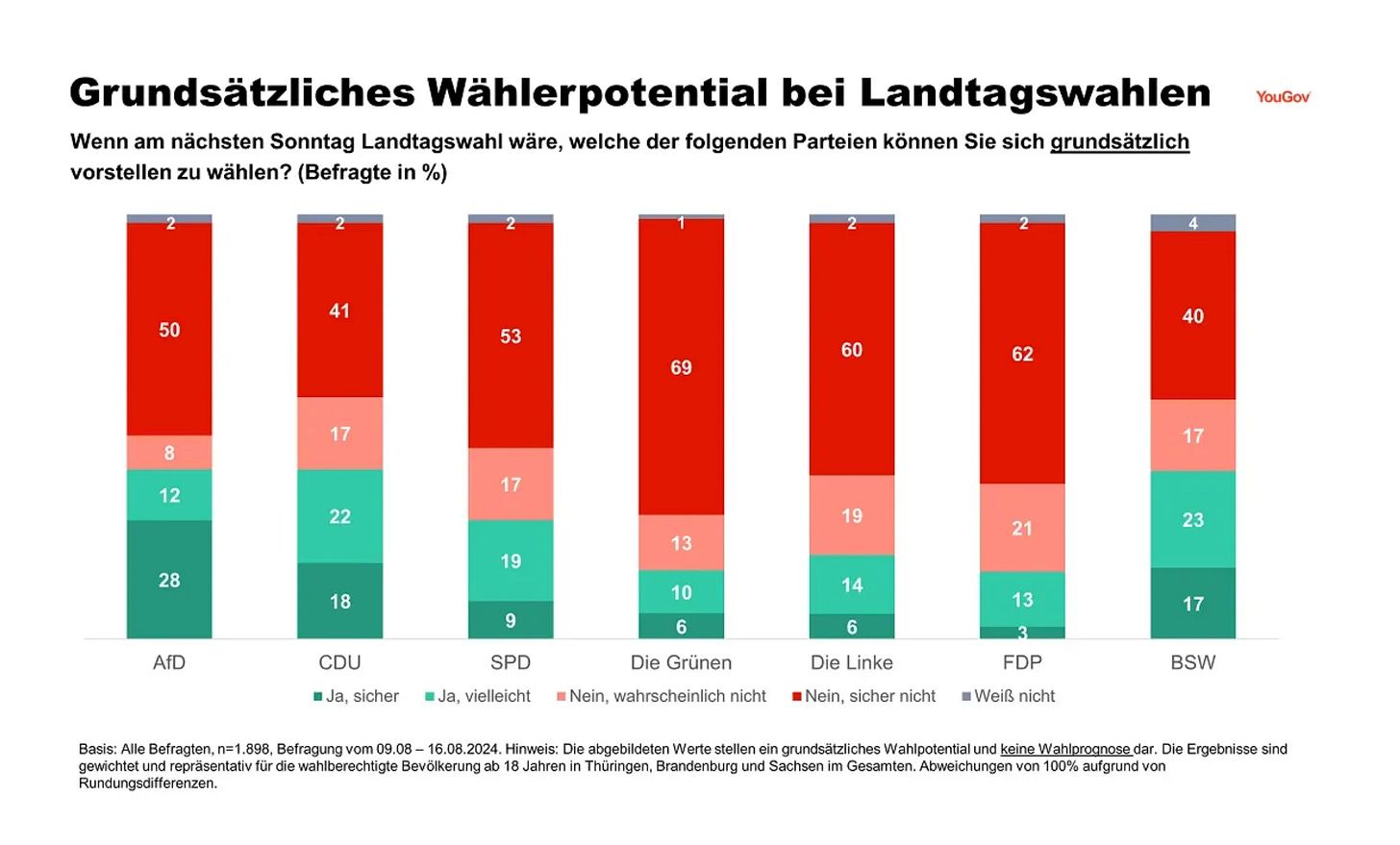 The AfD is not the only party that polemicizes against the Greens. In opposition, the CDU under its new post-Merkel leadership has been on the war-path against the Greens. It shows in the data. Across Saxony, Thuringia and Brandenburg well nigh 70 percent of Eastern voters exclude the possibility of voting Green. A bare 14 percent would consider voting for the party.