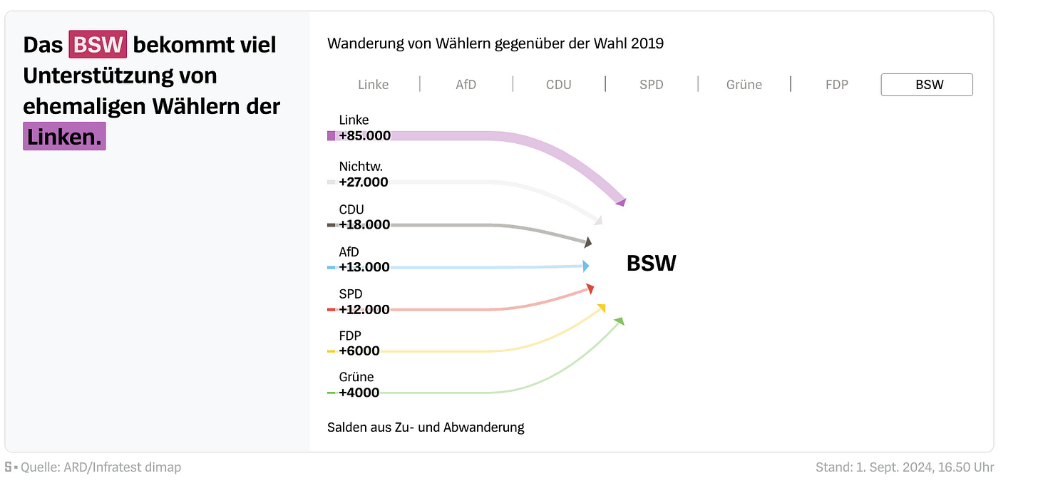 The other party that has done remarkably well is Sahra Wagenknecht’s upstart national-leftist party, BSW, which has taken large numbers of votes from Die Linke.
