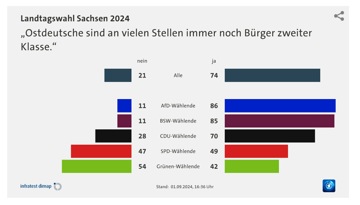As one of the most revealing surveys from Saxony showed. If there is one thing that voters of the AfD and Wagenknecht’s party have in common it is the feeling that East Germans are still “second class citizens”.