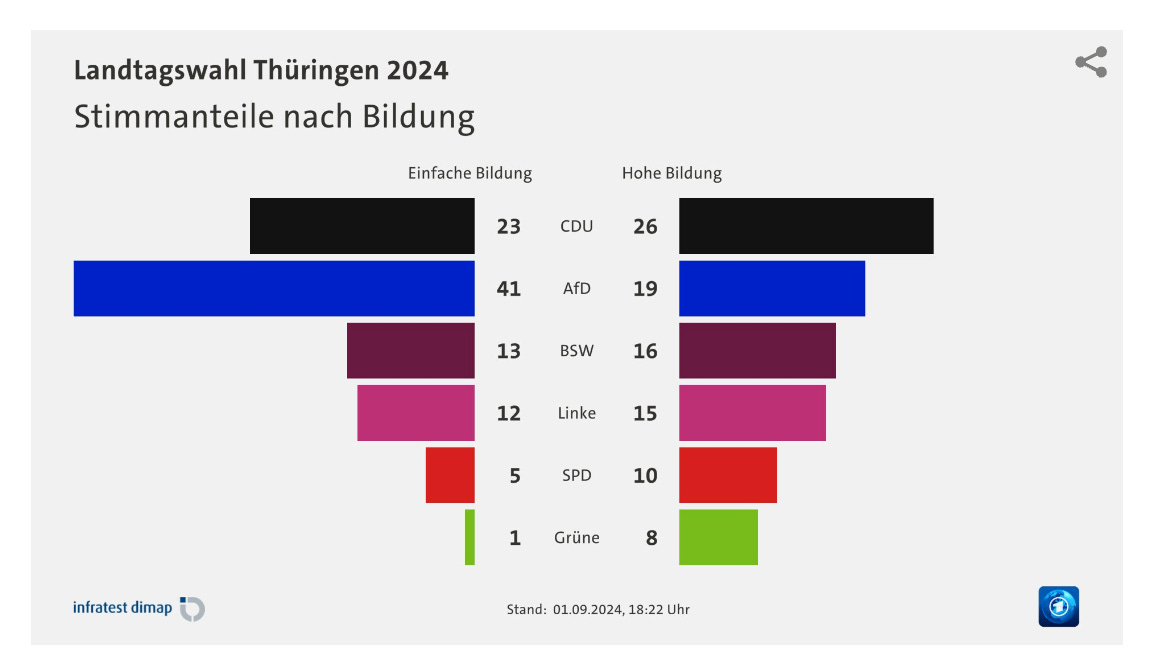 See for instance the distribution of votes between parties comparing voters with "simple education" (einfache Bildung) with “higher education” (Hohe Bildung)