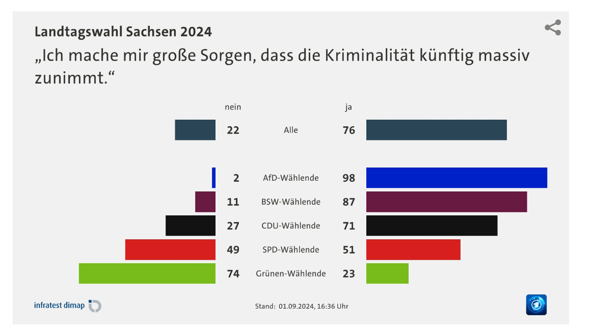 Even more decisive was the issue of crime. 98 percent of AfD voters in Saxony expressed the fear that criminality will “massively increase” in future.