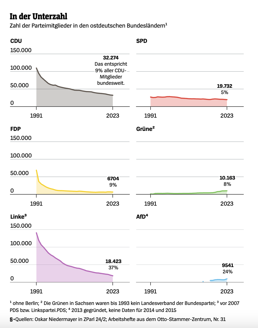 In terms of membership, it is worth noting that the AfD is far from being a “mass party”. Across the former East, party membership has plunged since unification and the CDU, the SPD and even the Greens have more registered members than the AfD.
