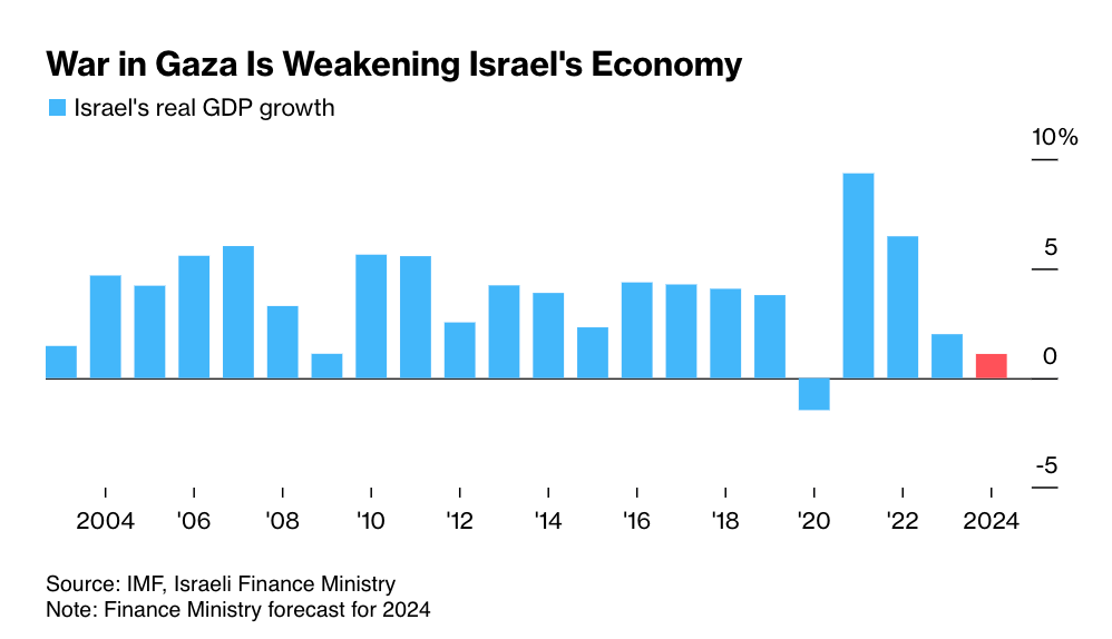 “Longer term, we consider that Israel’s economy will be more durably weakened by the military conflict than expected earlier,” Moody’s said. … Israel’s 12-month trailing budget deficit stood at 8.3% of GDP in August. The country’s full-year fiscal gap is set to be the widest this century, excluding the Covid-19 pandemic. This month, the finance ministry cut its 2024 economic growth projection to 1.1% from 1.9%. The estimate for next year was lowered to 4.4% from 4.6%.