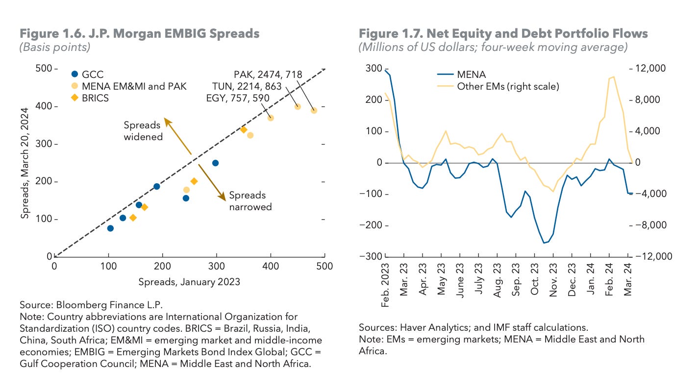 Sovereign spreads for global emerging markets have narrowed over the past year and are close to early 2023 levels for most MENA countries (Figure 1.6). However, they remain at distressed levels (more than 1,000 basis points) for Lebanon, Pakistan, and Tunisia. Meanwhile, in contrast to other emerging markets, the MENA region has largely experienced capital outflows since early 2023 (Figure 1.7). The region’s EM&MIs have not issued Eurobonds since the first half of 2023 (except for Jordan), and this issuance came at a higher cost than for GCC countries (Bahrain, Saudi Arabia, United Arab Emirates). The continued reliance on domestic financing risks further exacerbating the sovereign-bank nexus, given the already-high exposure of banks to sovereign debt in some EM&MIs (notably Egypt and Pakistan).