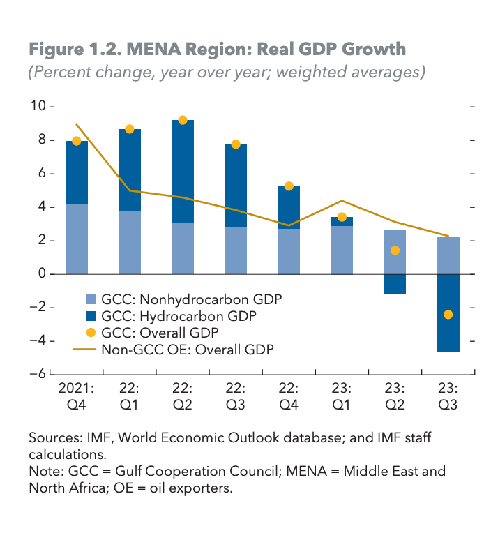 Voluntary oil production decisions largely drove growth in MENA oil and gas producers in 2023. Notably, Gulf Cooperation Council (GCC) countries experienced a marked deceleration in hydrocarbon growth following several rounds of voluntary production cuts by some OPEC+ countries. Consequently, real GDP growth in the GCC slowed sharply (to 0.4 percent), despite robust nonhydrocarbon growth driven by continued benefits from reforms to diversify the economy, high domestic demand, and gross capital inflows. Activity in non-GCC oil exporters was broadly stable, with heterogeneity across countries reflecting higher oil exports (Islamic Republic of Iran, Libya) and fragility (Iraq) (Figure 1.2)