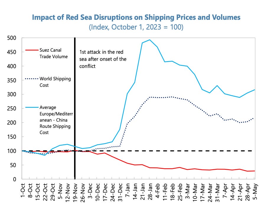 Red Sea disruptions hit shipping volumes and prices in the region.