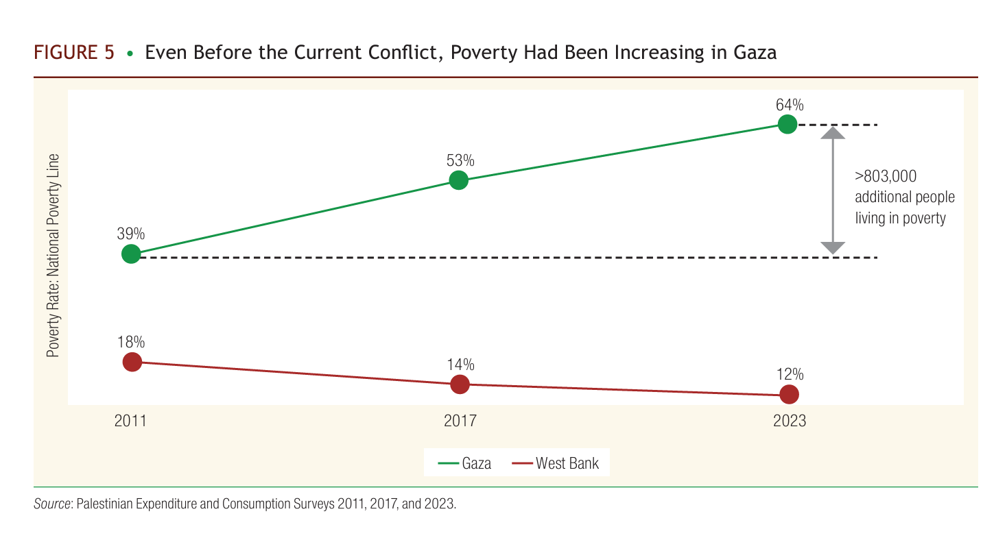 The divergence of the Gazan and West Bank economies before 2023 was already stark and reflected the long-term blockade imposed on Gaza by Israel.