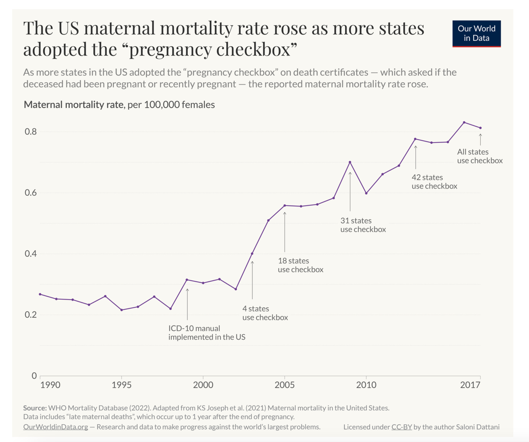 And if the data reporting issues are, indeed, real, what does that tell us about the system? I was left scratching my head at the idea that introducing an additional question on pregnancy, to a presumably controlled process of hospital management could introduce so much noise. If we cannot count on a simple box to be ticked the right way, what else is also being misreported? If a form records the surreal fact of the death of a pregnant 70 year old, how do we know whether it is the pregnancy, or the age that has been misrecorded?