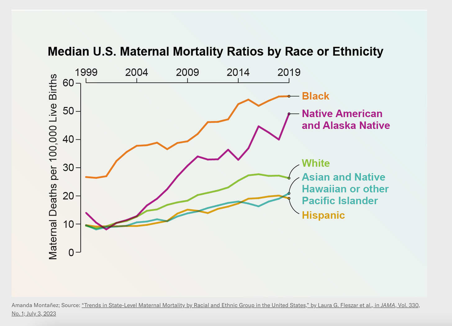 Contrary to the trends in every other advanced economy, the data show a doubling of maternal mortality in the US. For native American and black women, the numbers are nothing short of drastic. The maternal mortality rate for black women in America is forty to fifty times greater than for women in Switzerland.