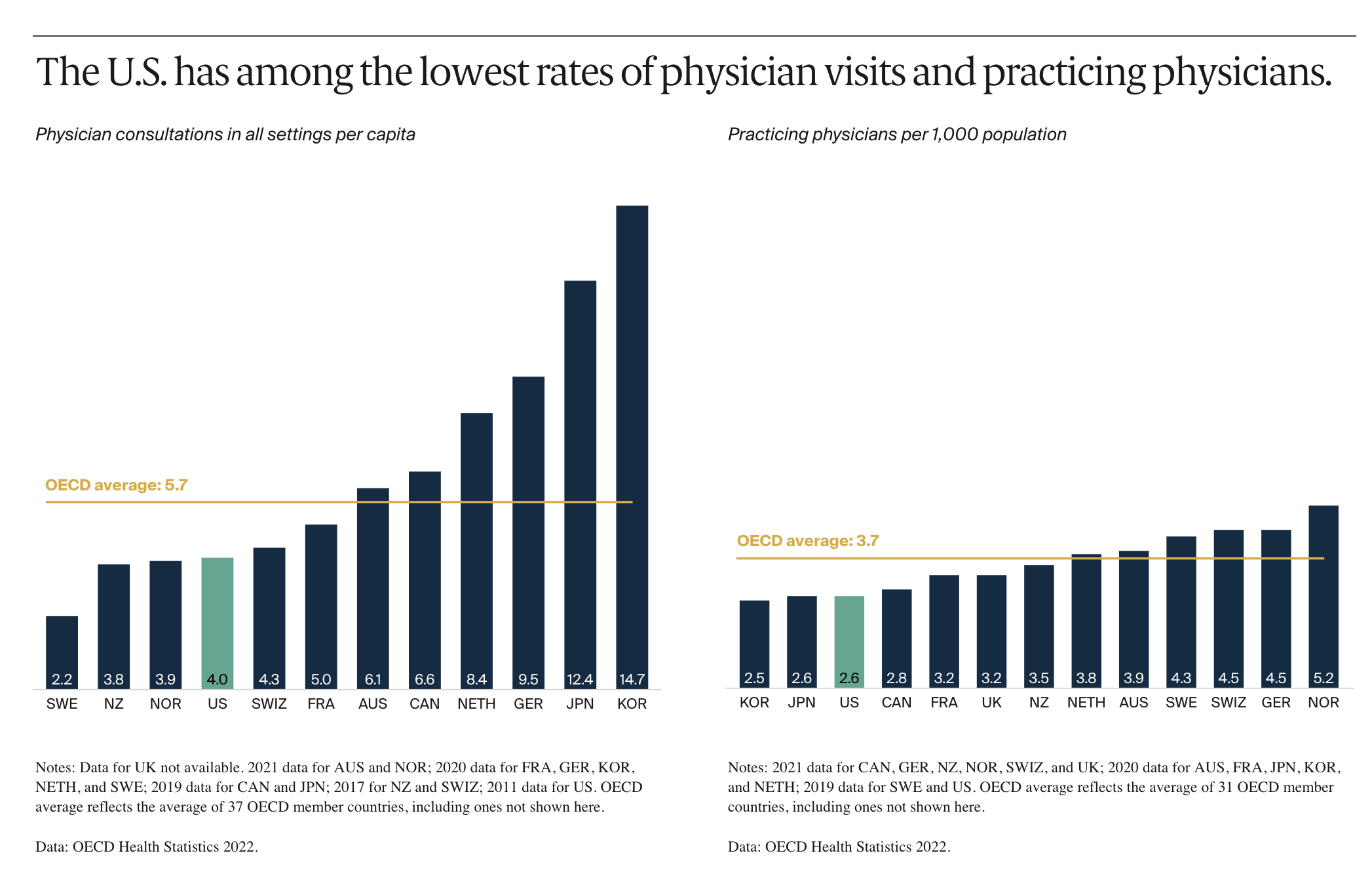 For all its exorbitant health spending, the US has the lowest availability of relevant medical personnel.