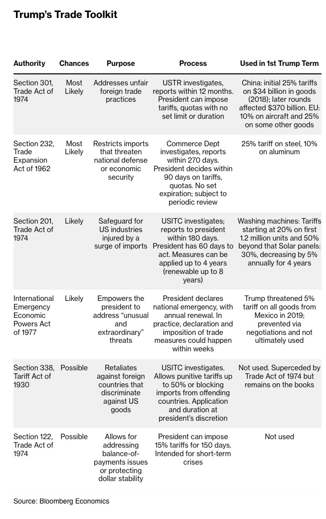 Much of Trump’s trade policy can be enacted by the Presidential pen using powers accreted to the White House over the years. Bloomberg offers this useful list: