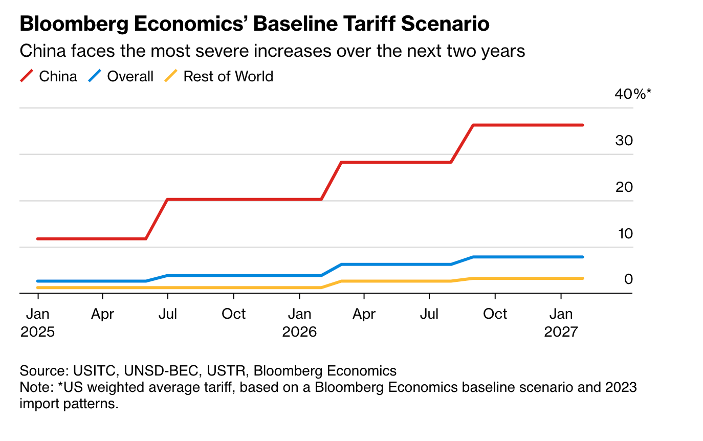 “existing lists from the Section 301 investigation his administration launched in August 2017 and that the Biden administration used to retain tariffs on Chinese imports. Initially, Bloomberg Economics’ expectation is that this path will lead to 15% additional tariffs on a broad range of consumer products ranging from pinball machines to pajamas and ballpoint pens that were limited targets during Trump’s first term. That would mean Trump’s first action would be to return tariffs to the levels proposed during his first administration before January 2020, when he signed what was called the “Phase One” deal with Beijing. It’s a plausible step given China has not lived up to the first deal and that it has an enforcement mechanism that can be easily triggered.”