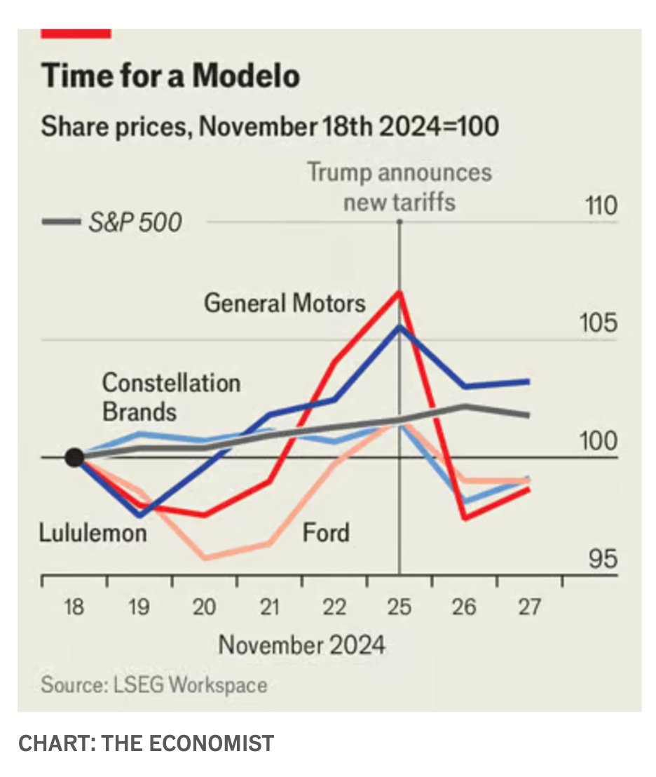 Particular industries and regions would suffer more pain. Despite its own oil-and-gas boom, America still imports 4m barrels of crude a day from Canada, for instance—much of which goes to the Midwest. More than half of America’s imports of fruits and vegetables come from Mexico. Carmakers, which have built factories in Mexico to produce vehicles for the American market, are especially vulnerable. America’s Ford and General Motors are among those that would be affected, as are Japan’s Nissan and Toyota, and Germany’s BMW and Volkswagen. The stock prices of several of the more exposed importers slumped on September 26th. General Motors’s fell by 9%; Ford’s by almost 3%. Big importers of materials from affected countries, including Lululemon, which sells clothes, and Constellation Brands, which imports Mexican beers such as Corona, Modelo and Pacífico, fell by 2-4%.