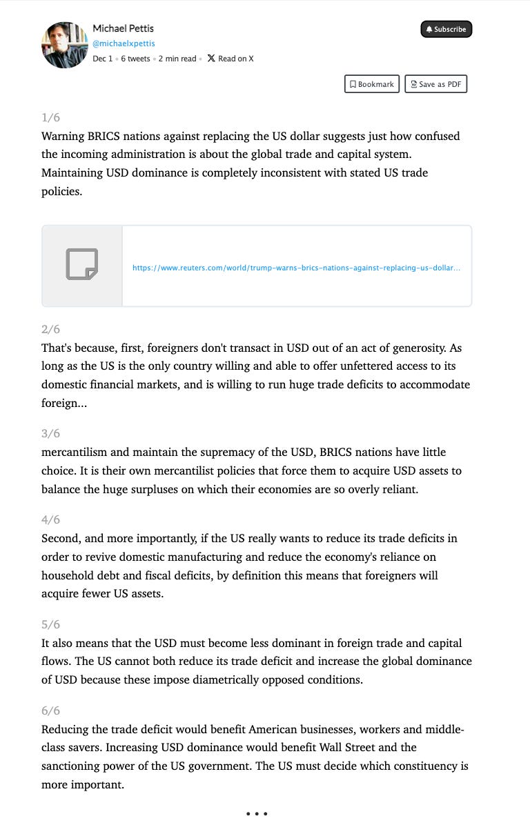 But, precisely if you take the Pettis view of protectionism as a blunt but nevertheless defensible tool in a situation of global imbalance, Trump’s latest threats to impose sanctions on BRICS countries for seeking to break their reliance on the dollar, make no sense.