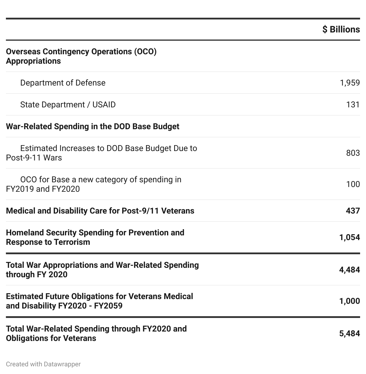 Summary of War Spending, in Billions of Current Dollars