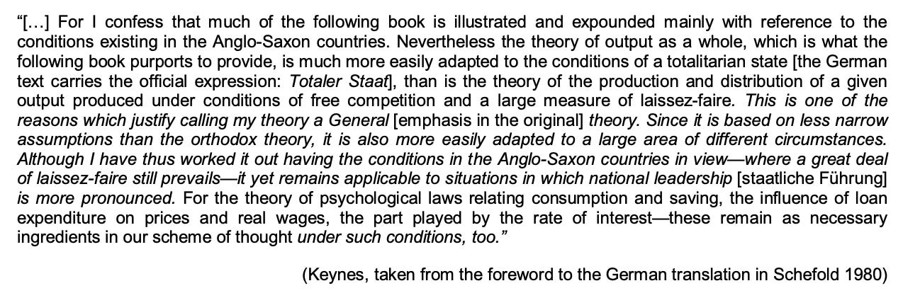 There is some scholarly controversy about the origin of the text. Keynes himself was an anti-fascist. But it was also undeniable that an activist, militarist dictatorship, operating a closed economy was well placed to implement Keynes’s macroeconomics to the full.