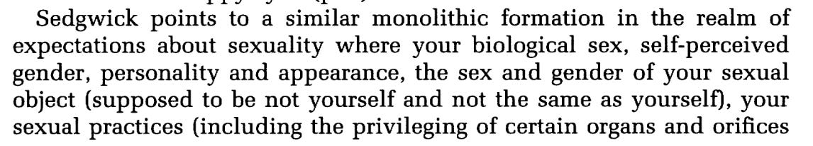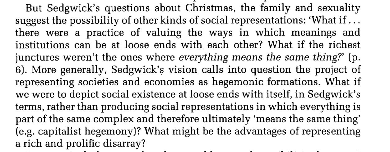 But it poses the question: Who has actually delivered on that agenda? As K Gibson-Graham show in the End of Capitalism, whilst pointing to overdetermination, actually producing an account in terms of overdetermination has proven elusive and more often than not analysis slides back into the simplicity of the first position. On their reading this isn’t accidental. Gibson-Graham drawing on queer theorists like Eve Kosofsky Sedgwick criticized the overly tight and coherent conception of reality implied by standard social theory. It is that underlying set of assumptions - ontological if we may be so bold - that repeatedly frustrate the intention of the analysts of overdetermination.