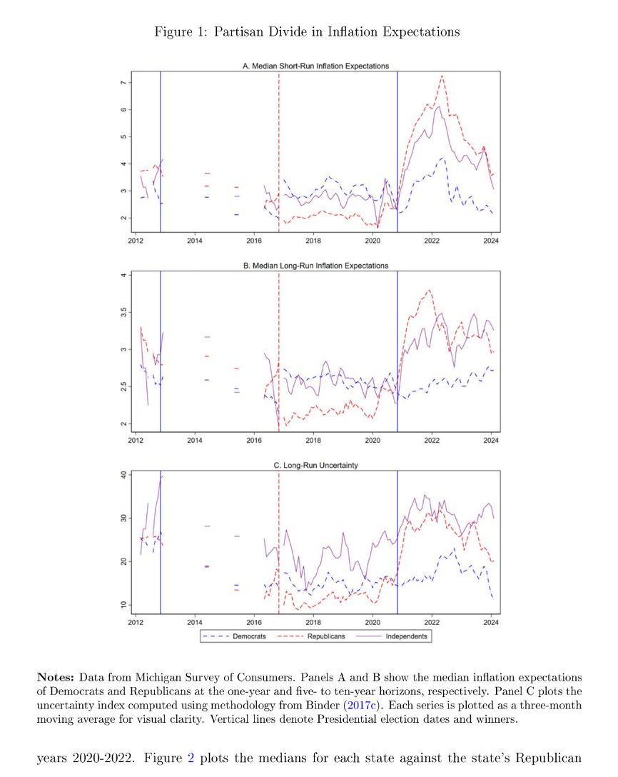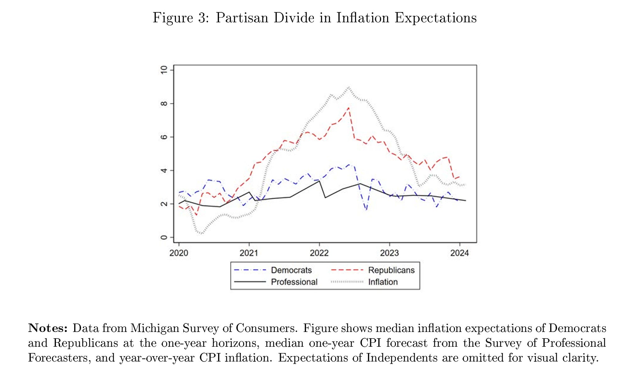 We document that, during the COVID-19 era, the inflation expectations of Democrats remained strongly anchored, while those of Republicans did not. Republicans' expectations not only rose well above the inflation target, but also became more sensitive to a variety of shocks, including CPI releases and energy prices. … Counterfactual exercises imply that, had all expectations become as unanchored as those of Republicans, average inflation would have been two to three percentage points higher for much of the pandemic period, ceteris paribus. …. Before 2020, members of the President's party have inflation expectations that are about 0.92 percentage points lower than those of independents and members of the opposition party have expectations about 0.11 percentage points higher, so the gap between members of opposing parties is about 1.0 percentage point. Since 2020, those effects have more than doubled in magnitude, and the gap between Republicans and Democrats is 2.5 percentage points. Males, college-educated respondents, and homeowners all have systematically lower expectations than their survey counterparts, but the partisan gap in in ation expectations is the largest in magnitude.