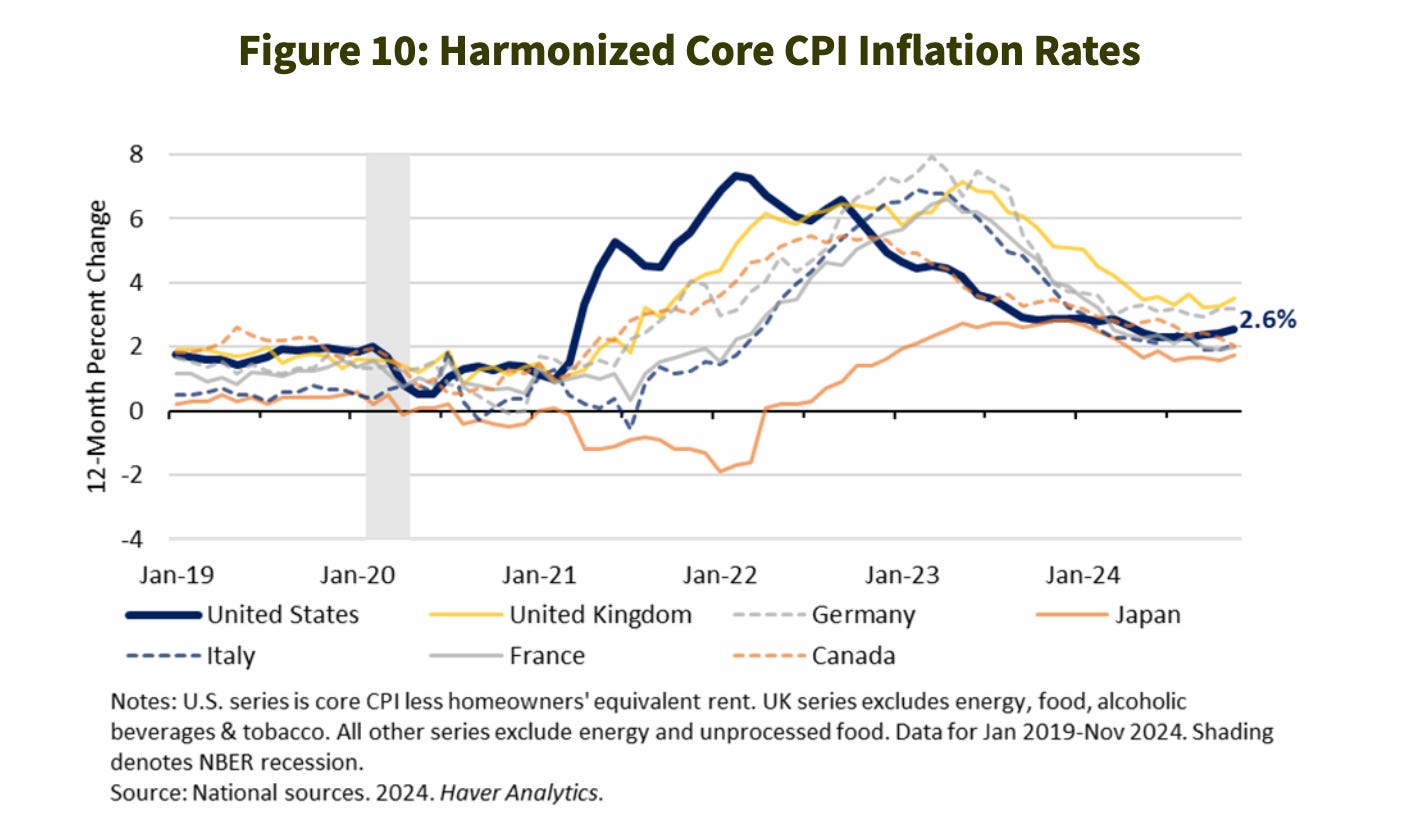 First, consider comparisons to other advanced economies. Virtually all advanced economies experienced a significant spike in inflation. But in the United States, inflation fell earlier than in other G7 economies.[14] At the same time, America enjoyed strong growth. Real GDP now exceeds pre-pandemic levels in all G7 economies. But it grew by more in the United States: by 11.5 percent from the end of 2019 to the third quarter of 2024, followed by 7.3 percent in Canada and 5.6 percent in Italy.[15] This is largely attributable to robust U.S. productivity growth, which far outstripped productivity gains in other G7 economies.[16]