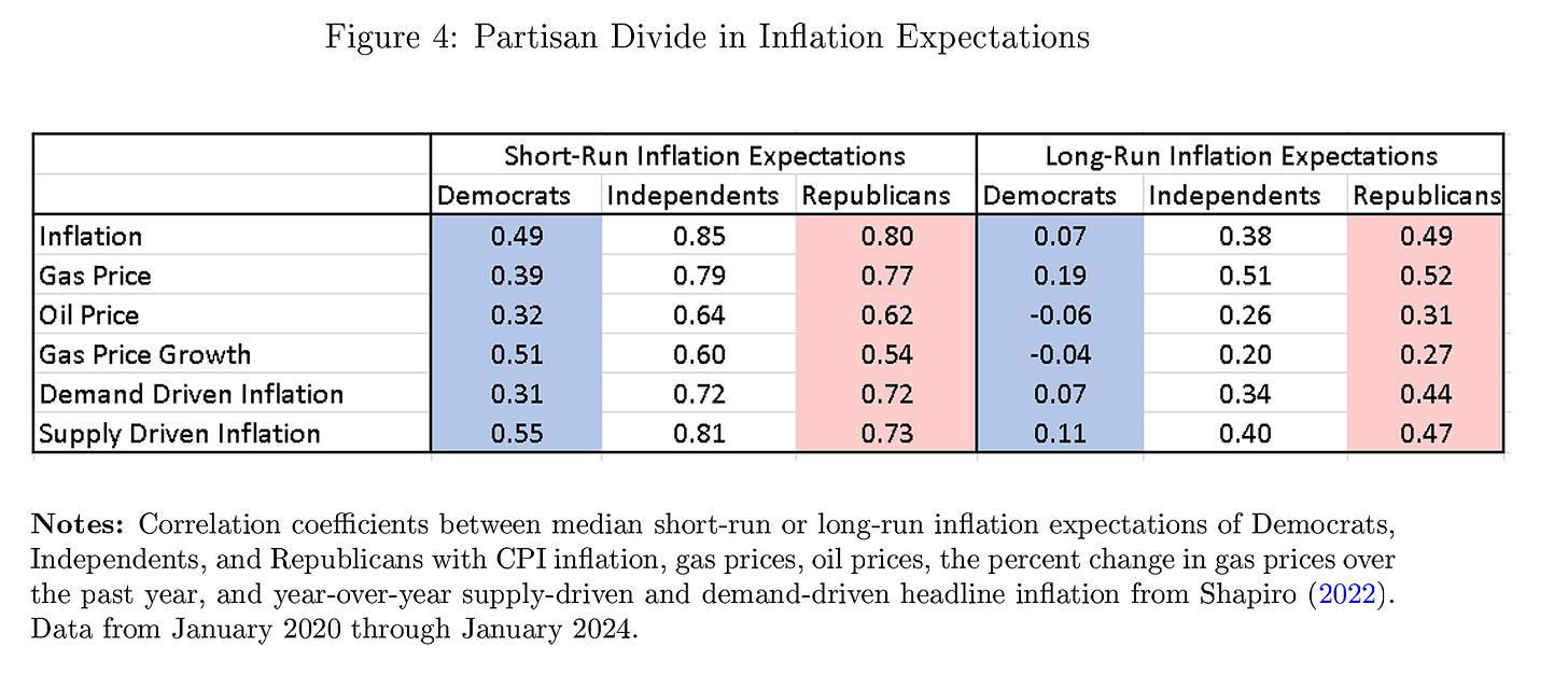 One variable that weighed heavily on Republican inflation-expectations is the price of oil. The correlation between short-run inflation expectations and the gas and oil price is roughly twice as large for Republicans as it is for Democrats.