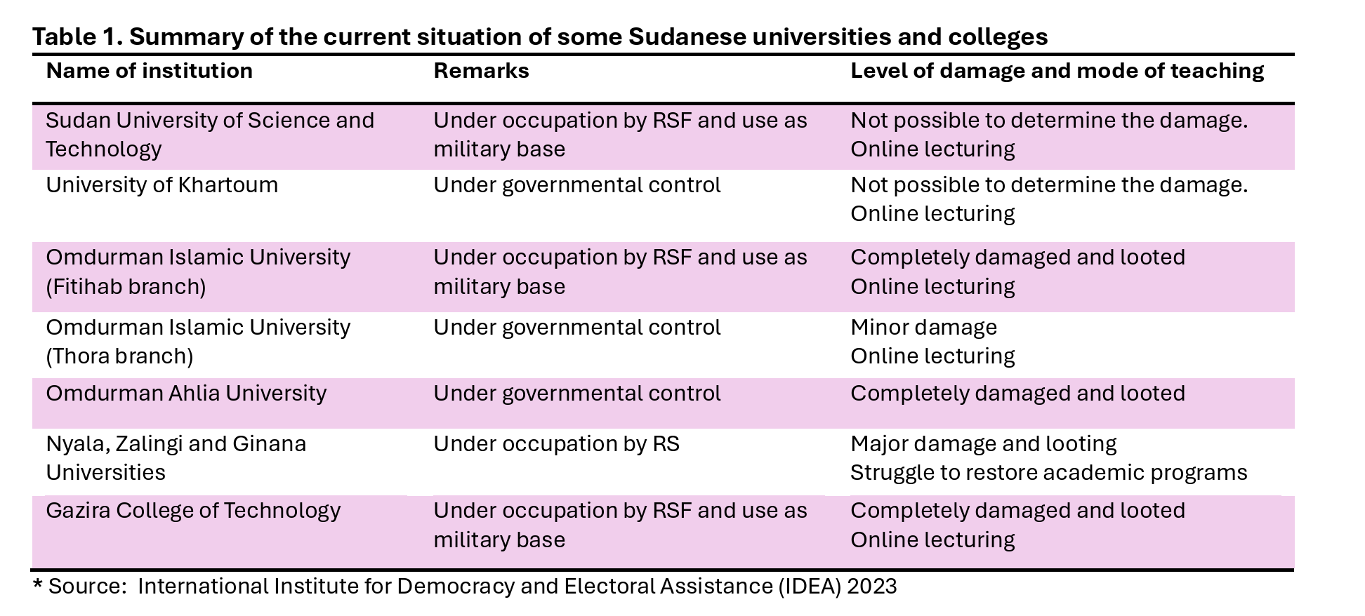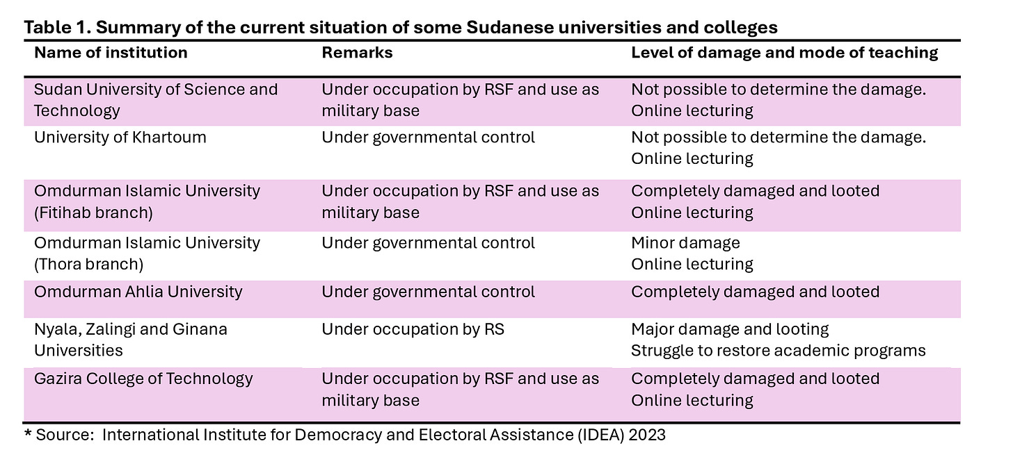 Given that more than 10.4 million Sudanese were forcibly displaced, among them scientists, the educational system has been hampered. Available data indicate that in Khartoum State (both the political and educational center of Sudan), 39% of governmental and 73% of non-governmental universities were occupied by RSF (the rebel militia), whereas it was 10% of governmental and 8% of non-governmental universities in Gezira state. This contrasts with 3% of governmental and 5% of nongovernmental university in South Darfur. Some universities and colleges were partially or completely damaged, while in some it was not possible to determine the damage. This has led to complete shutdown of the universities, forcing students to find expensive alternative ways to continue their education or abandon it altogether. Scientists and science in Sudan faced many challenges, which are difficult to overcome.