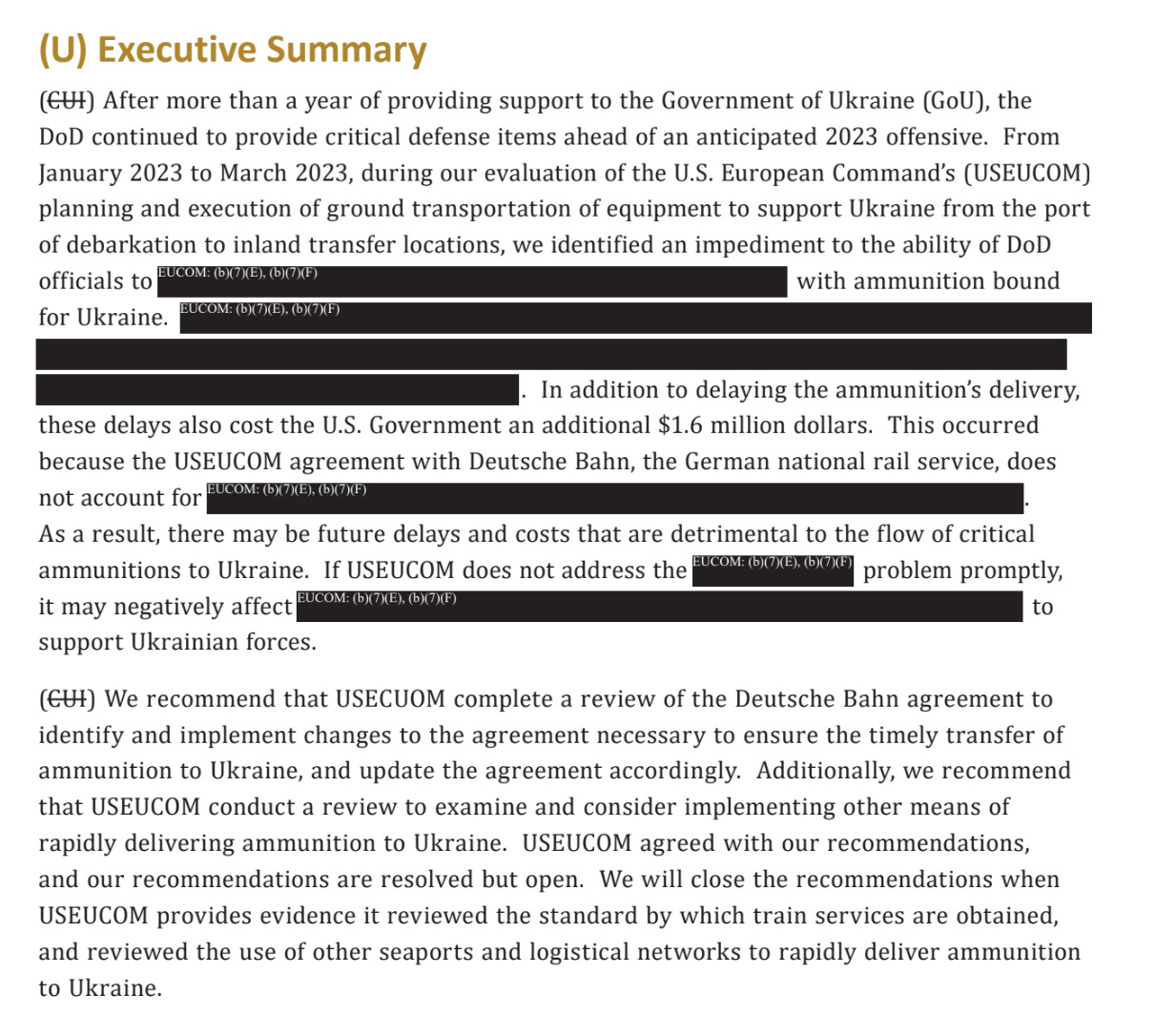 In 2024 it emerged from a heavily redacted report of the Inspector General of the US Department of Defense that a breakdown in contractual relations between US European Command and the Deutsche Bahn over the winter of 2022-2023 had left large shipments of ammunition for Ukraine stranded in depot.