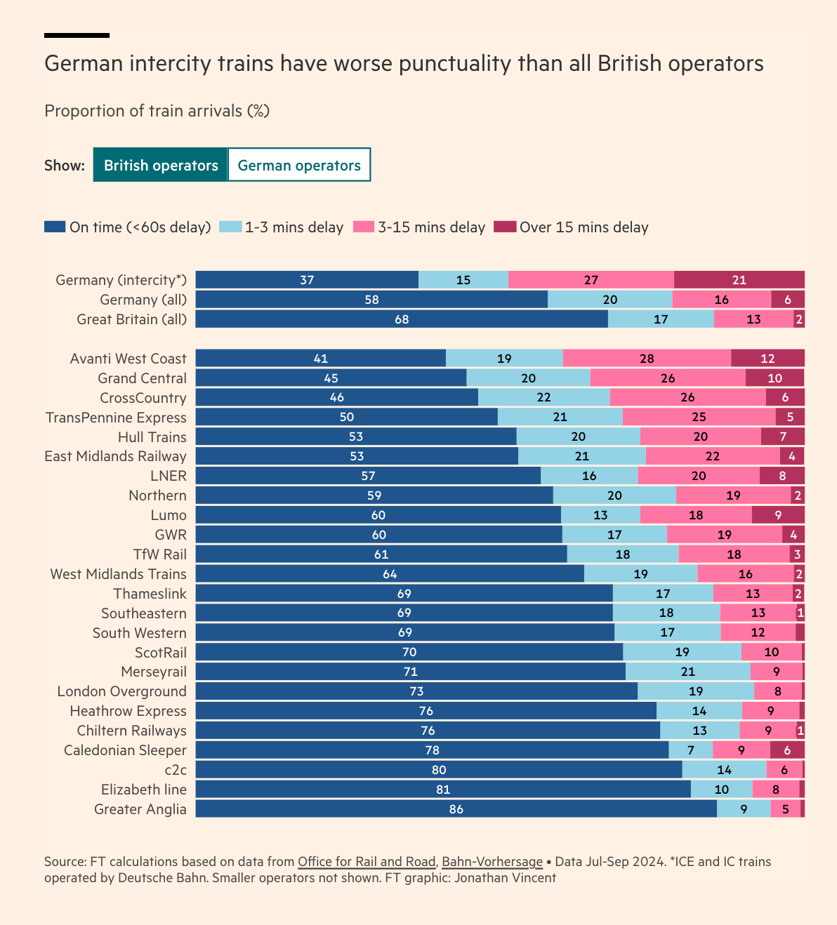And at least as far as reliability is concerned, Scholz is in a world of his own. This is what emerged from the fact checking of a crack FT team. Their painstaking examination of data for 1.9bn train arrivals between February 2024 and the end of January 2025 - 5mn arrivals per day - showed that there is, in fact, no part of Britain’s system that is as unpunctual as Germany’s intercity system. Overall Germany’s system underperforms the average performance in the UK. The percentage of serious delays in three times larger in the German system as a whole than for the UK rail system. The rate of serious delays on German intercity trains is ten times larger than on the UK system.